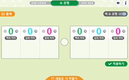 자연수의 덧셈과 뺄셈, 분수의 덧셈과 뺄셈을 연습하며 덧셈과 뺄셈 개념을 이해할 수 있습니다. 자연수의 곱셈과 나눗셈을 연습하며 곱셈과 나눗셈 개념을 이해할 수 있습니다. 각 개념별 문항이 랜덤으로 제공되어, 숫자를 입력해 보며 연산 연습을 할 수 있습니다. 큰 수(만, 억, 조)와 소수 두/세 자리 수 등 수에 대한 개념을 이해할 수 있습니다. 나누기와 곱하기를 이용하여 약수와 배수를 이해할 수 있습니다. 수 배열표를 이용하여 공약수와 공배수를 이해할 수 있습니다. 퀴즈네어 막대를 이용하여 약분과 통분에 대한 개념을 이해할 수 있습니다. (크기가 같은 분수, 약분, 통분) 분수와 소수의 곱셈의 원리를 조작을 통해 이해할 수 있습니다. 활용교구자연수의 덧셈과 뺄셈, 자연수의 곱셈과 나눗셈, 분수의 덧셈과 뺄셈, 수와 자릿값, 큰 수, 소수 두/세 자리 수, 약수와 배수, 분수와 소수 모양 만들기를 이용하여 규칙을 만들고 이해할 수 있습니다. |